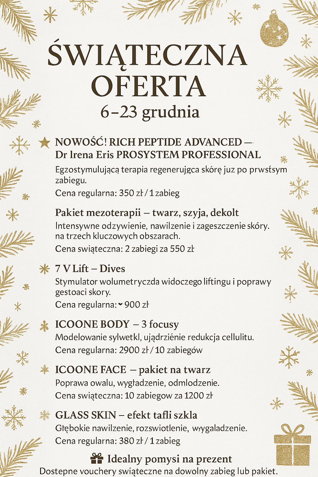 Jesteśmy jedynym w okolicy Poznania salonem firmowym Dr Irena Eris, w którym można skorzystać z zabiegów dostępnych jedynie w ekskluzywnych spa! Autorski masaż twarzy, szyi i dekoltu Dr Irena Eris pozwala przenieść się klientowi do krainy relaksu! Terapie anti -age dedykowane do indywidualnych potrzeb to nasza specjalność !